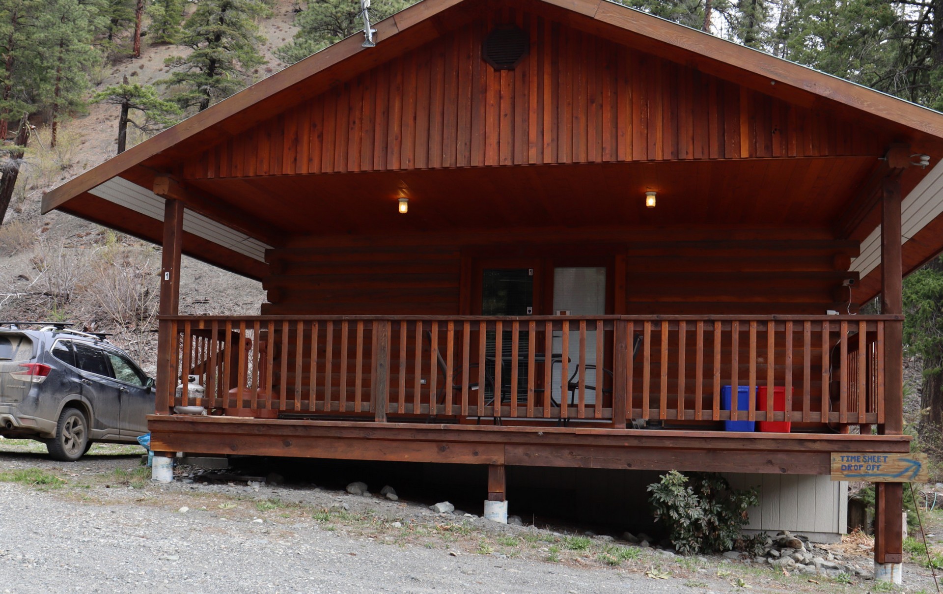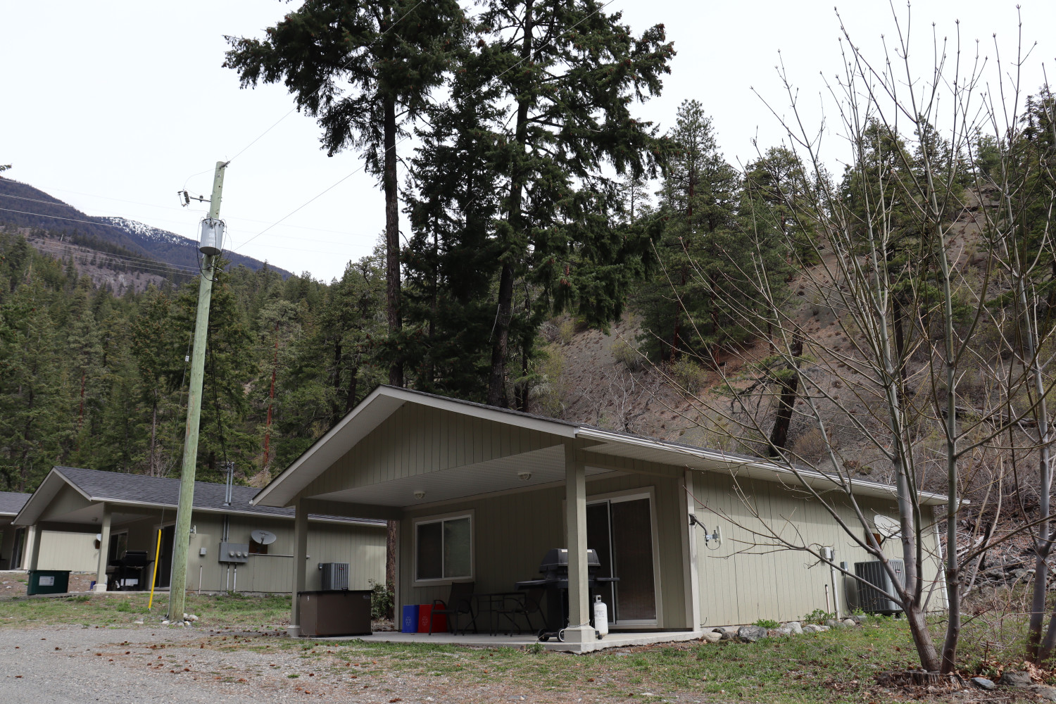 You'll find that every cabin is fully equipped with all the comforts of home. Each unit boasts a complete kitchen, a full bathroom, two cozy bedrooms, a welcoming dining area, and a comfortable living room. You'll also appreciate the convenience of having a washer and dryer right in your cabin and plenty of closet space to store all your belongings. Additionally, you can enjoy the great outdoors on the covered cement patio, complete with a table and chair set, a BBQ with propane, and an outside tap for your convenience. Stay connected with internet access and keep cool with air conditioning throughout your stay.
